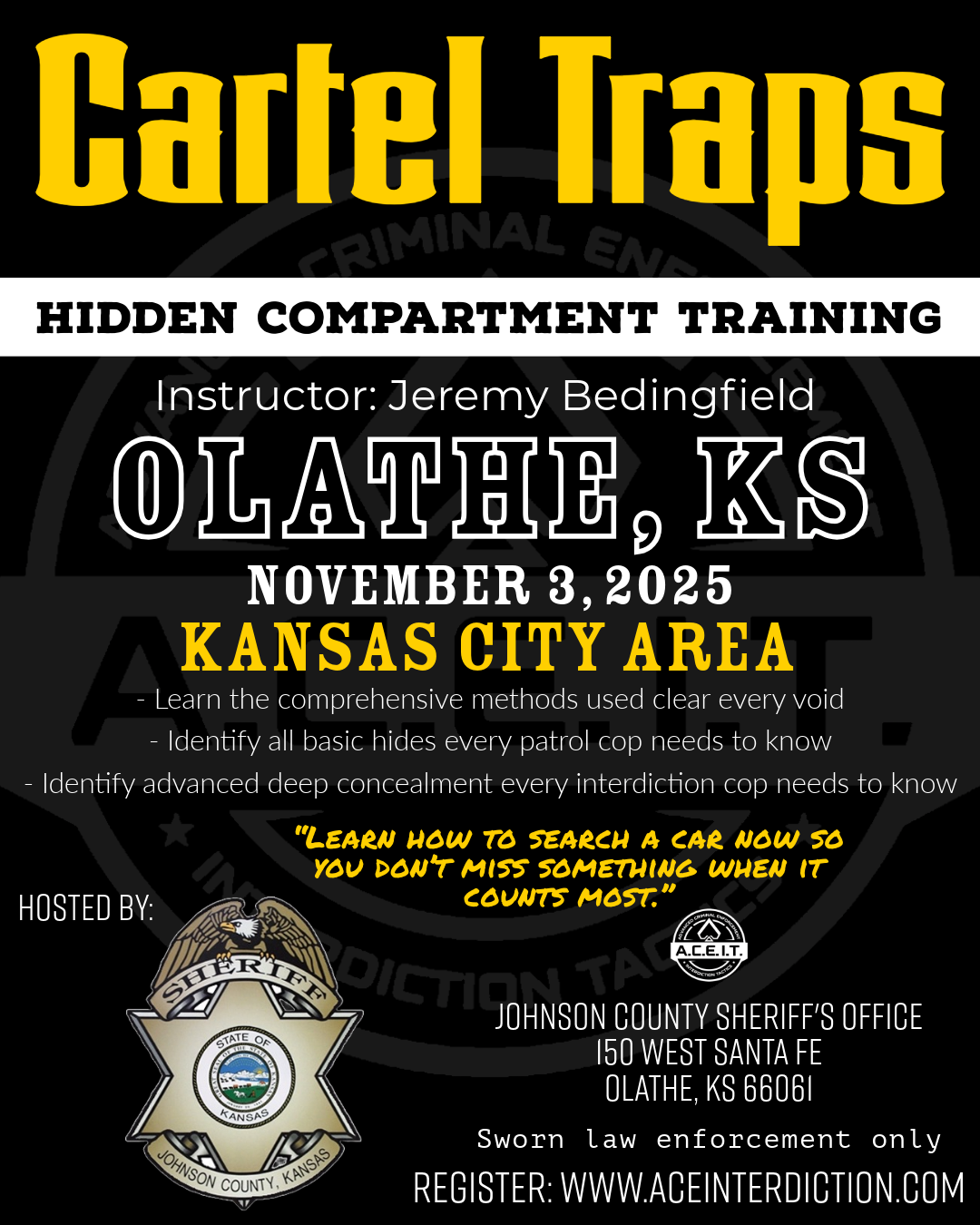 The hands on portion allowed us to search vehicles equipped with traps and to reinforce the concepts learned in the classroom. Overall, the training provided a much better understanding of what to look for during vehicle searches and would recommend this class to any LE working patrol or investigations.