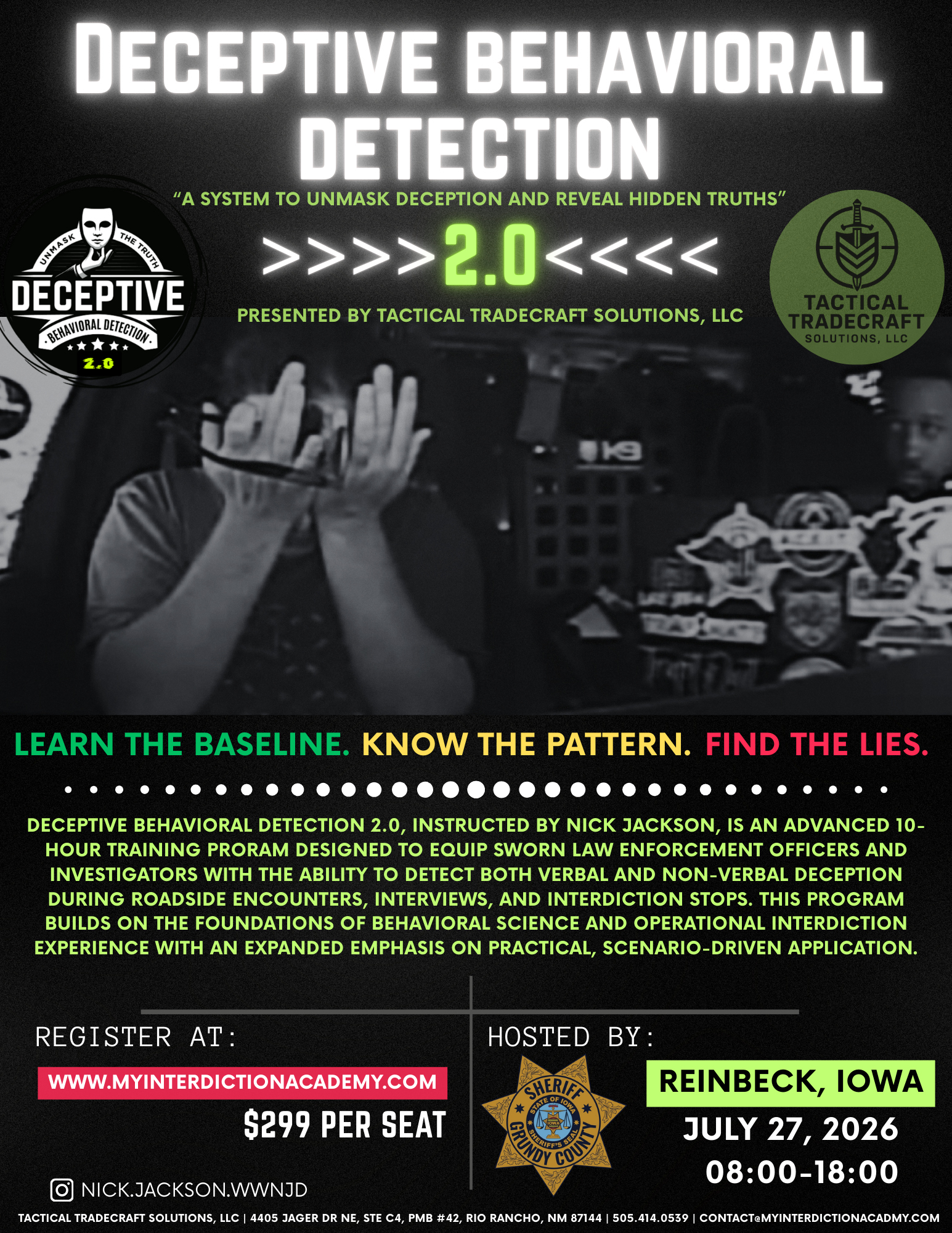 Deceptive Behavioral Detection is an advanced course focused on recognizing and interpreting the subtle cues of deception. Students will learn to analyze verbal and nonverbal behaviors, microexpressions, and body language patterns linked to truth and deceit. Through applied exercises, case studies, and behavioral science frameworks, participants will enhance their observational accuracy and critical thinking in real-world situations. Certificates will be issued.