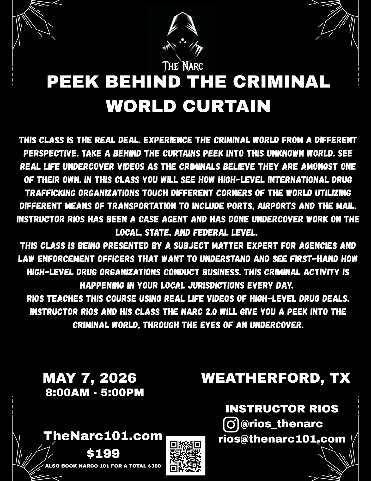 This class is the real deal. Experience the criminal world from a different perspective. Take a behind the curtains peek into this unknown world. See real life undercover videos as the criminals believe they are amongst one of their own. In this class you will see how high-level international drug trafficking organizations touch different corners of the world utilizing different means of transportation to include ports, airports and the mail.